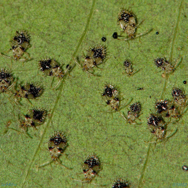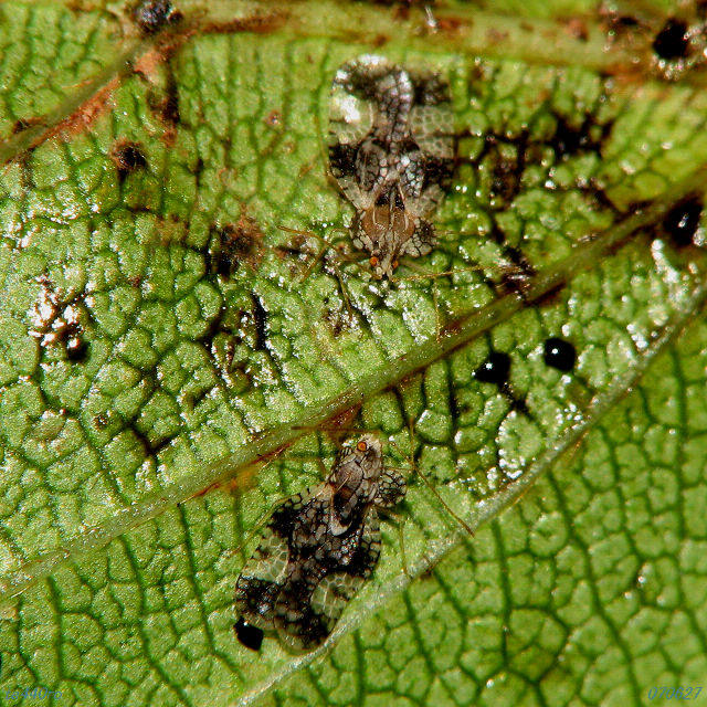 ▼ナシグンバイが汚れたサクラの葉の上にいた。この時期、サクラの葉の上では幼虫の姿も見られた。070627