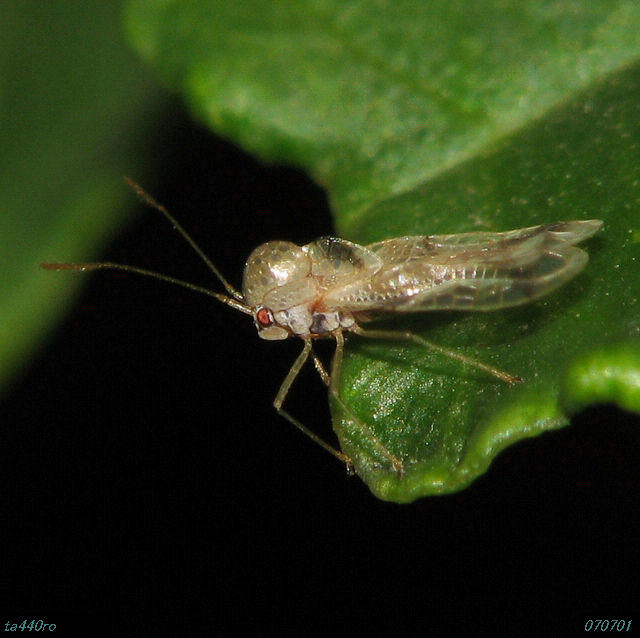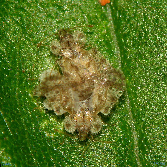 ▼自宅のノウゼンカズラに付いていたグンバイムシ。ツツジグンバイに似ているが、果たして・・・・。横から見るとまるでヘルメットをかぶっているかのようだ。070701