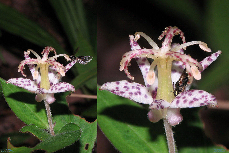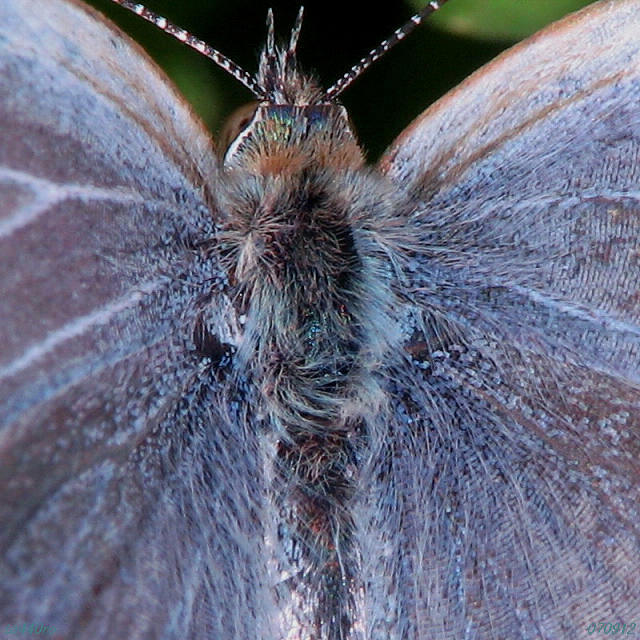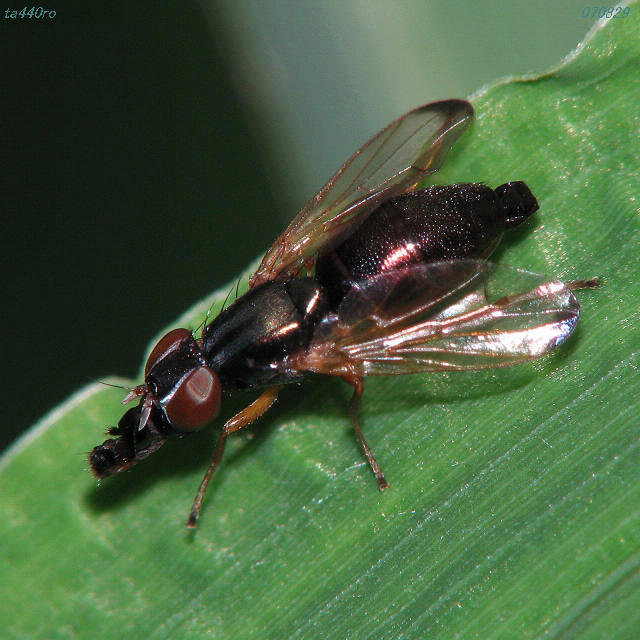 まずダイズコンリュウバエというヒロクチバエ科のハエです。このハエは色彩は割合と地味ですが、形が変わっているために意外と目立ちます。このハエは配偶行動の際にオスがメスに口移しで餌を与えたりするようで、その姿が妙に艶かしく、人間染みたその様子はハエとしては余りに特異に見えます。070829