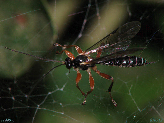 この写真のメスは腹の先から産卵管を出しているようなのですが、何のためにそんなことをしていたのかは不明です。「一寸のハエにも五分の大和魂」のハエ男さんにいろいろ教えて頂きました。http://furumusi.aez.jp/joyful1/joyful.cgiどうもありがとうございました。070827