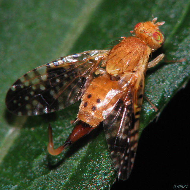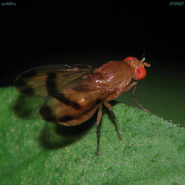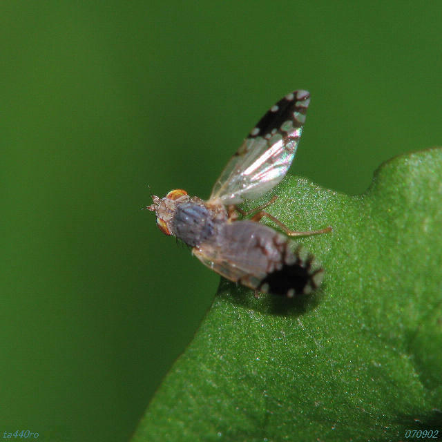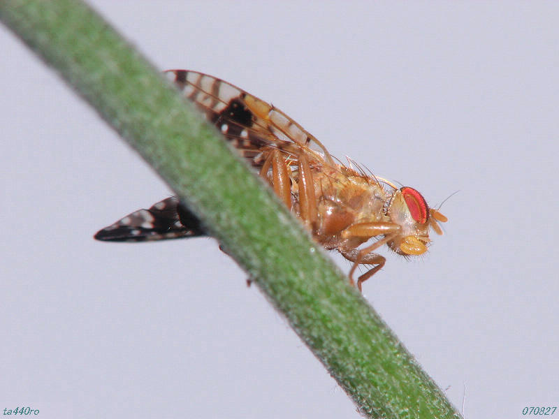 羽に模様がついているのはミバエの仲間に多いのですが、このシマバエの仲間にもよく見られます。ミバエ科と違い、シマバエ科のハエは翅をたたんで止まります。ちなみにこのシマバエは、ヒラヤマシマバエという普通種です。070902