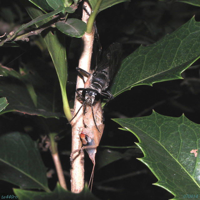 写真を拡大してみると獲物は褐色型のクビキリギスでした。調べてみれば狩人蜂はクロアナバチ、大型のツユムシ類を狩るということでした。ここでのクビキリギスは終齢でしょうが、このくらいの大きさでないと、クロアナバチが成虫になるまでの餌としては不足してしまうのでしょうね。それにしてもクビキリギスが丁度この大きさに成長した頃に、クロアナバチたちも成虫として羽化してきて、その子孫のためにクビキリギスを狩るという自然の摂理、余りにも見事です。070914