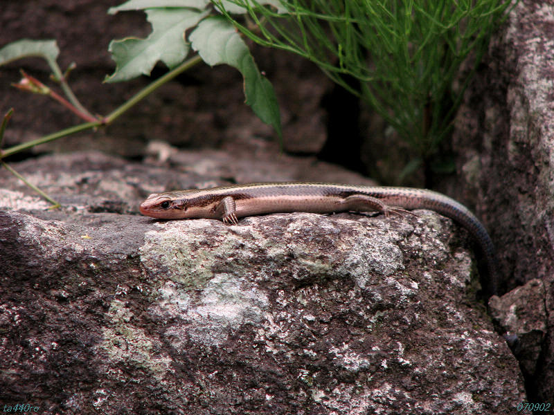 しかし、トカゲは、カナヘビと生息環境が微妙にシンクロしているようで案外そうでもなさそうです。トカゲをよく見かけるのは、寺社の石段や民家の石垣、川原なら流れから外れた土手の大きめの自然石の上などのゴツゴツした場所が多く、そのような場所を好んでいるふしがあります。