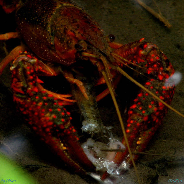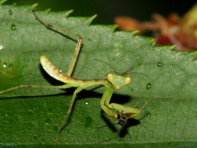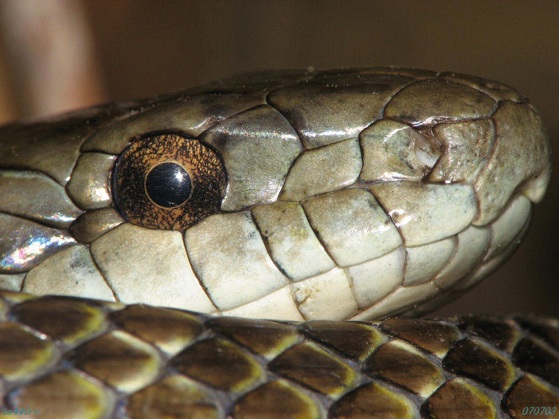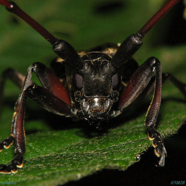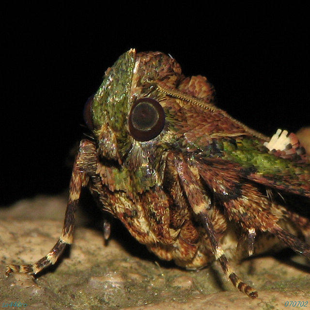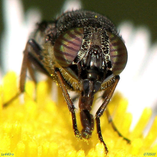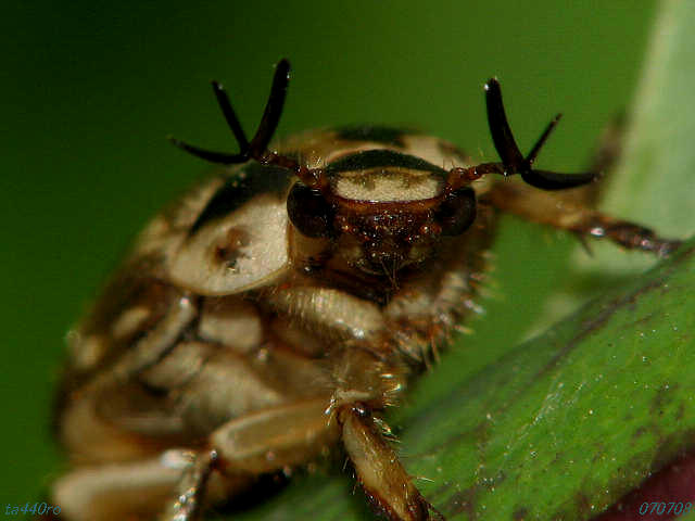 特徴的な顔のクローズアップです。写真に撮ると、顔の一部が鉄で出来ているかのような質感をもっており、複眼は回折現象のせいか、縞々模様が映っています。070508