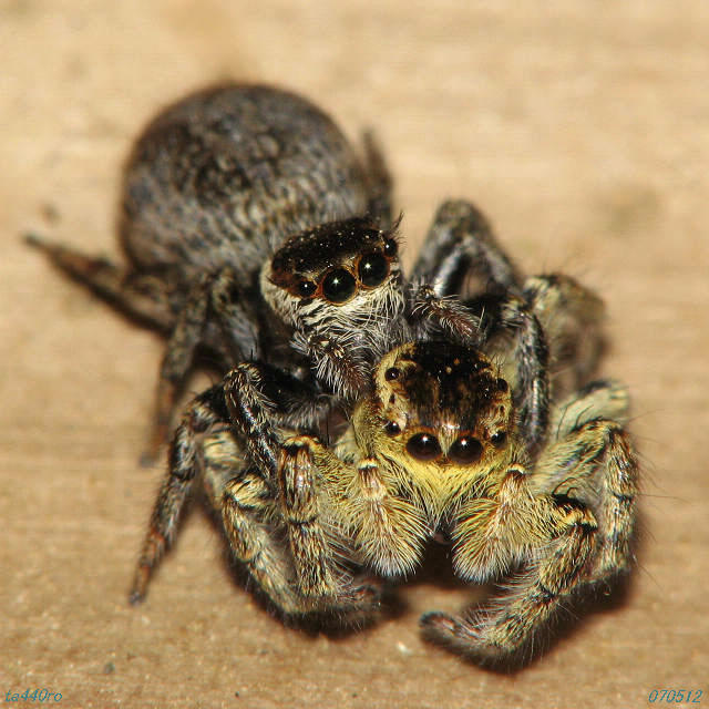 ▼マミジロハエトリ♀がネコハエトリ♂を抱えている。ヨカナーンの首を掲げるサロメのようである。070515