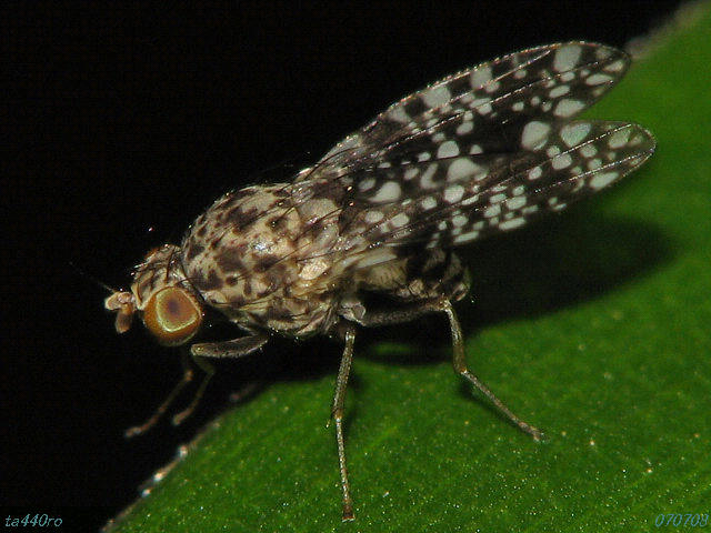 ▼シモフリシマバエ このハエの生態も調べたが、載っていない。ただ、ただ翅の模様が見事である。よく似た翅をもつミバエの仲間もいるのだが・・・・。070708