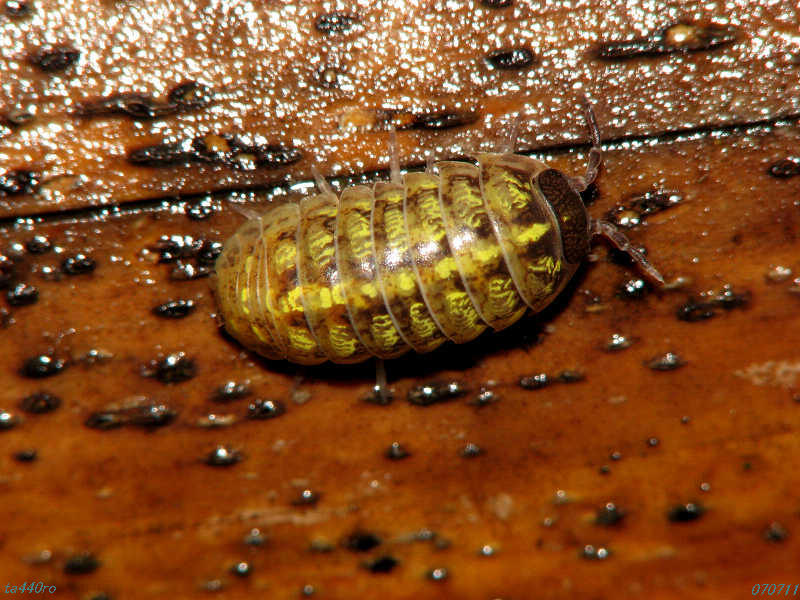 ▼竹垣の上を歩く黄色いダンゴムシ。薄い色のダンゴムシはよく目にするが、こうハッキリ黄色いのは余り見たことがなかったような気がする。