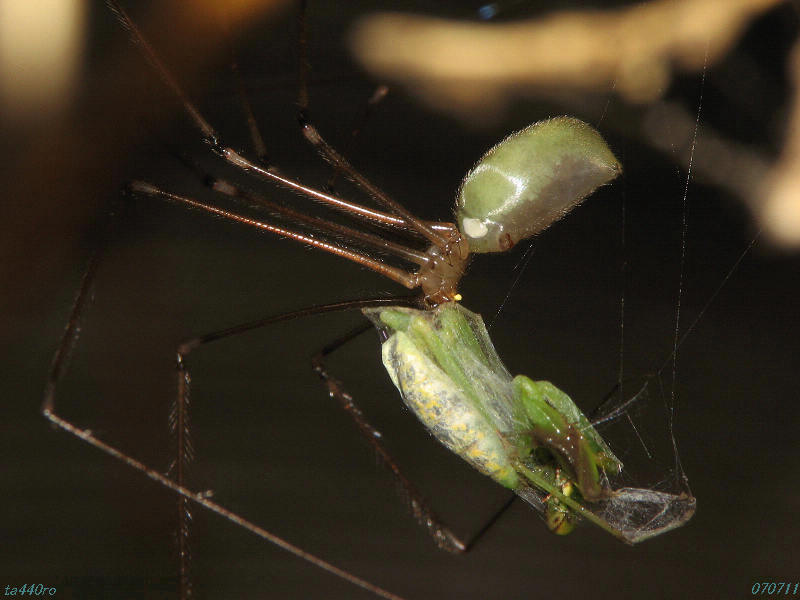 ▼淡い色のイエユウレイグモはカマキリの幼虫を食べていたせいか、緑色がかっていた。雨の日でも軒下は濡れない。