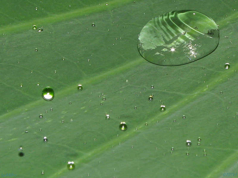 ▼蓮の葉の上で小さい水玉はポンポンと弾ける。大きい水玉はプルプル震える。