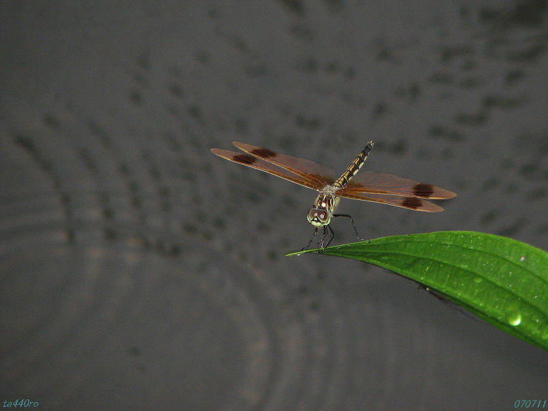 ▼雨に濡れそぼつコフキトンボ(オビトンボ型メス)。あとで調べて個体数の少ない種類であることが判明し、幸運に浸る。