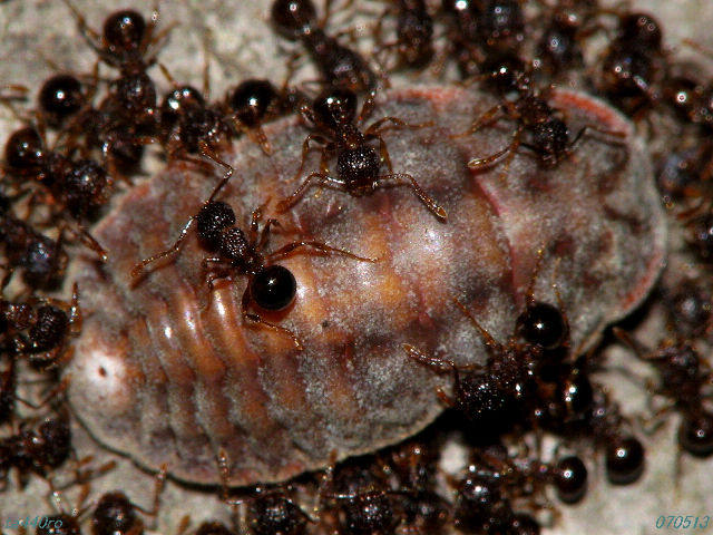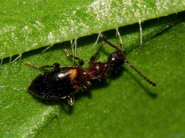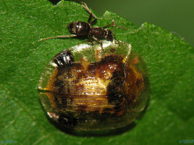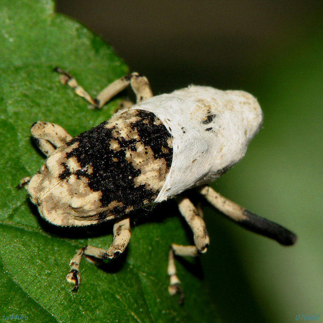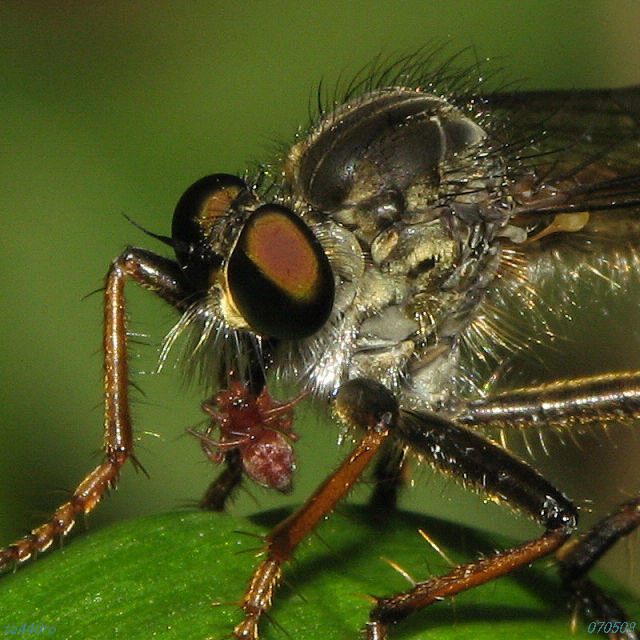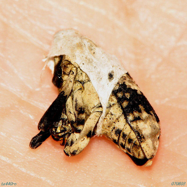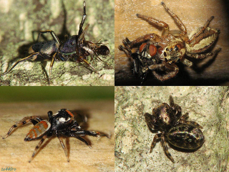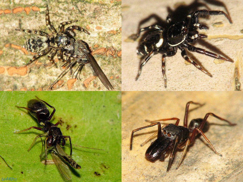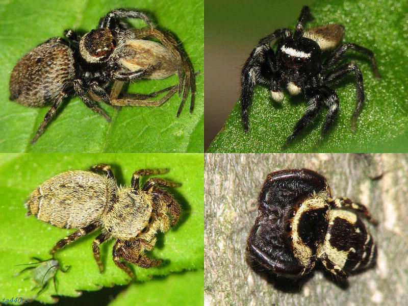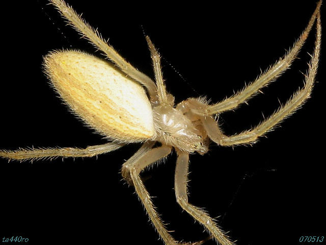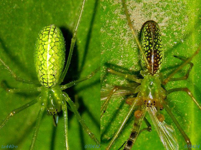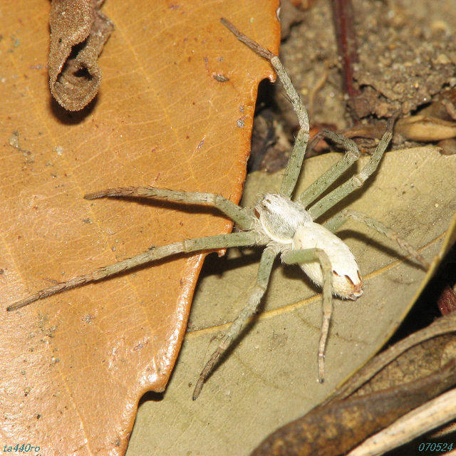 かつてエビグモ科に Philodromus roseus という頭胸部と腹部斑紋が白い種がいたそうですが、生殖器の一致からキンイロエビグモ(P. auricomus)と同一種の色彩変異;ハラジロ型とされました。しかし生息環境も大きさも異なり、生殖的には断絶されているらしいことから、最近では再び別種であると考える人も多いようです。
