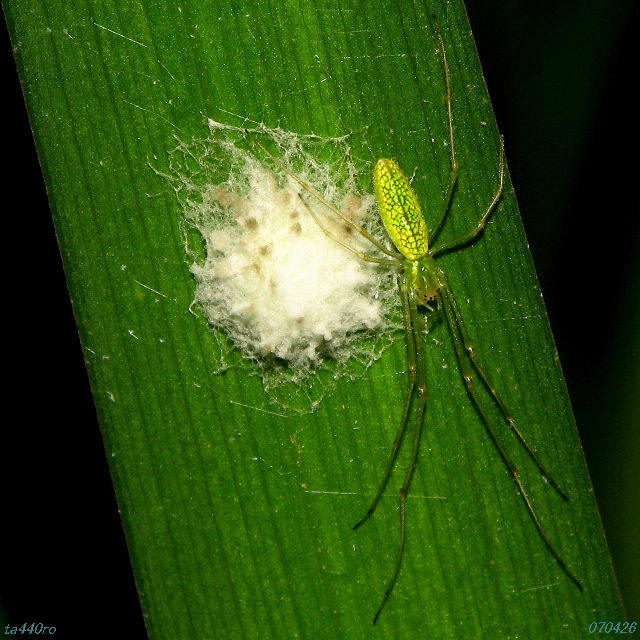 淡い黄色が美しいこのクモの名はコガネグモダマシといいます。コガネグモ科に属し、草原などで垂直・水平円網を張って生活するクモです。色彩変異もありますが、コガネグモに似たような色模様にはならないようなので、なぜ「コガネグモダマシ」なのか私には分かりませんでした。ところが網の存在を忘れてこのクモを見るとき、シャコグモやハシリグモの仲間と見誤ります。実際に私もうっかりミスをしました。http://ta440ro.blog.shinobi.jp/Entry/124/どうやらそんな意味が込められているようです。