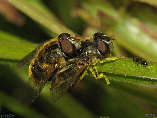 ▼ルリハナアブ。「金の虻と銀の虻」に見えるが。070518