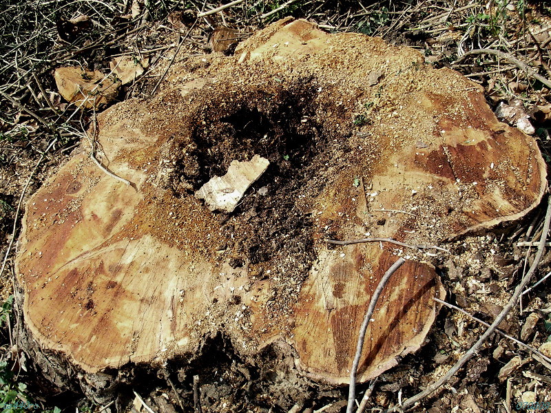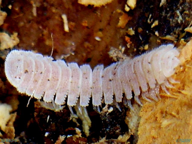 さて切り株の中央を見ると少し朽ちている部分があって、小さい橙色の蟻やらも蠢いていました。掘り返してみると、小さな白い生きものが出てきました。どうやらマクラギヤスデの仲間のようです。でも図鑑やネット上で見る「マクラギヤスデ」より色白で小さいので幼体か近縁種でしょうか・・・・。070309