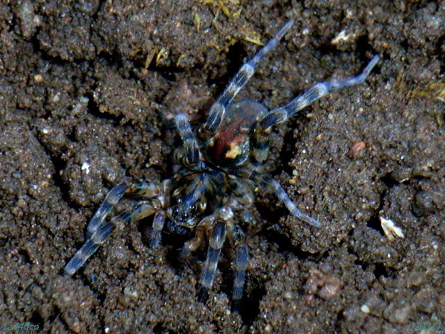 追記・・・・クモの名前が分かりました。こちらの「クモ蟲画像掲示板」で伺ったところ、カガリビコモリグモだろうとのことです。割合に珍しい種類のようで、腹部の赤い部分を「篝火」に喩えて命名されたようです。教えて下さったきどばんさん、mmmさん、どうもありがとうございました。http://bbs1.whocares.jp/bb/view?bbn=kjrshoj&vt=0