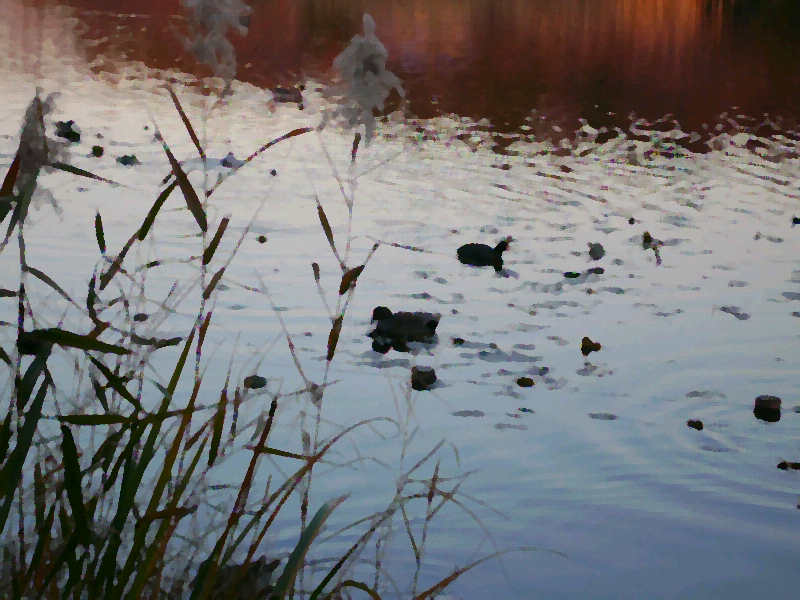 ▼自然公園の池のオカヨシガモとオオバン(油絵加工したので、何の鳥だか不明ですね、笑)