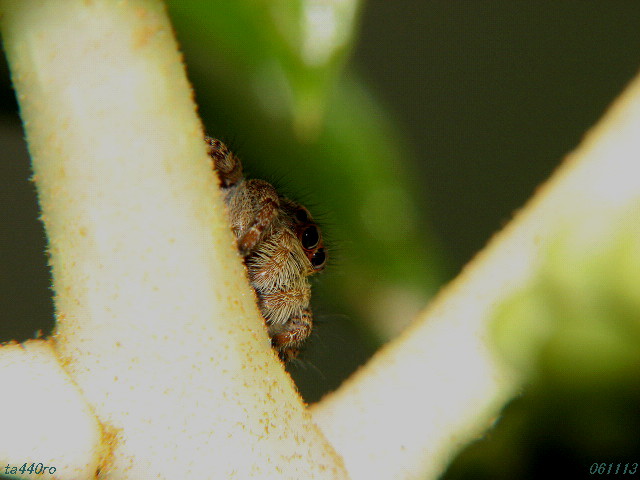 ▼ハエトリグモの一種=花に集まってくる彼らを狙うのですが、体格負けしてしまうことも多いようです。大きすぎる獲物を取り逃がしているところを目撃しました。061113