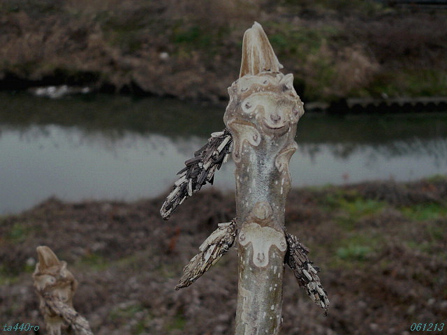 途中、川の土手に生えていたオニグルミには、来年の春に伸ばすであろう芽がもうすっかり準備してありました。葉痕はまるで猿の顔のように見えます。そしてその猿には手足が生えていて・・・・つまり、ミノムシの蓑が3つも付いていて・・・・妙にコミカルに見えたのです。