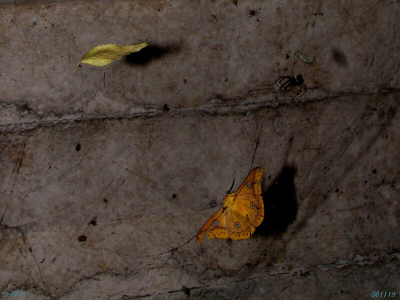 ウスタビガは秋深くまで見かける大型のヤママユの仲間ですが、この個体は蜘蛛の餌食となったのか早々に死を迎えてしまったようです。もっとも、雄は羽化したての雌を求め、交尾が終われば用済みですから、それでいいのかも知れません。羽化した雌はすぐ雄と交尾し、さっきまで自分が入っていた繭に産卵すれば、やはり責務を全うしたことになります。ウスタビガも他のヤママユ同様、成虫の口器は退化していて、何も口にすることはありません。つまり成虫になってからの彼らの存在意義は、「繁殖」だけにあるわけです。