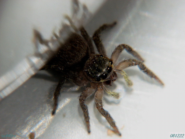ただ最後の食事の方法がどのようなものだったのか、実に想像力を掻き立てられます。残された状況からは、コップの底にあった薄い繭のような巣、これによってミルワームは絡め取られているようにしか思えません。ミルワームがコップの底を這いずり回れば、ハエトリグモが底につくった巣と干渉したことは確かでしょう。しかし獲物がグルグル巻きにされて吊るされたというのでは他の蜘蛛の仕業と同じではないですか。ハエトリグモがそんな獲物の捕り方をするというのは聞いたことがありません。観察していた訳ではないので断定はできませんが、再度調べてみる必要があるでしょう。