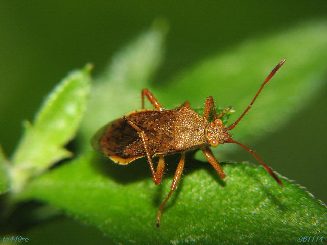 庭先のヒメツルソバとエリゲロンの混生している場所で見つけたアカヒメヘリカメムシです。気温がだいぶ低くなり、そろそろ昆虫も少なくなり始めた11月中旬のことです。何枚か撮影したうちの1枚にこんなポーズのものがありました。背中を後ろ脚で擦っているようです。背中が痒かったのでしょうか?そもそもクチクラで出来ている彼らの外骨格の体に痒みなんてなさそうです。でも何か異物感があって擦り落とそうとしているのでしょうから、何かしらの感覚は持っている訳です。