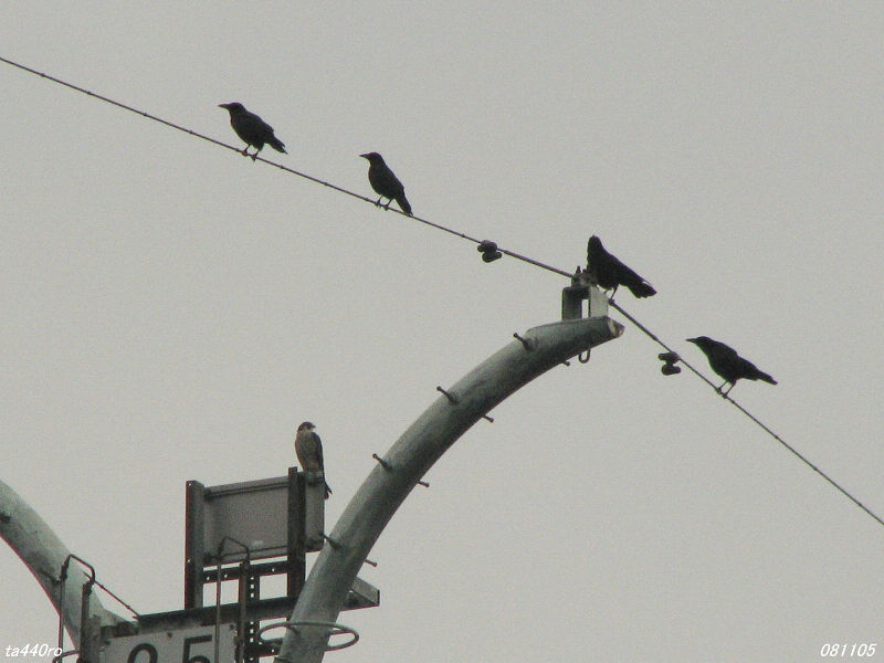 ▼ハシボソガラスに包囲されるハヤブサ。でも全く意に介さない様子。