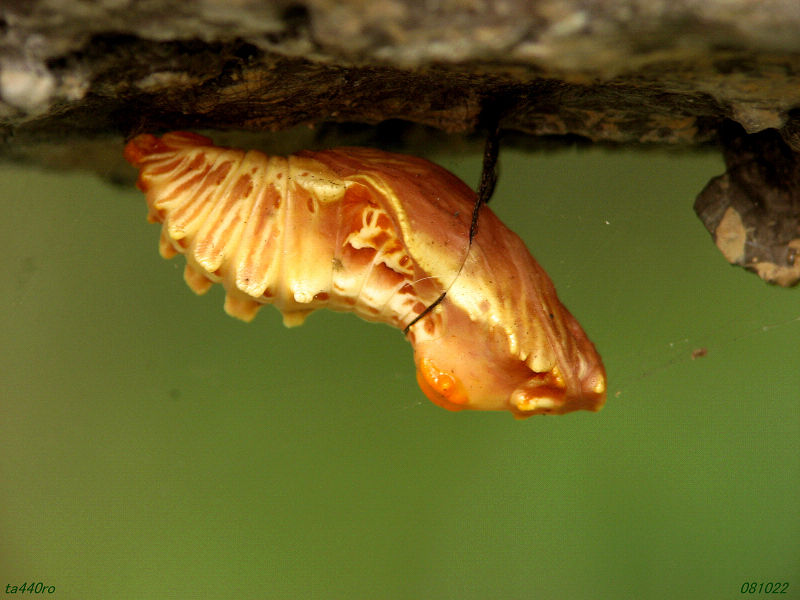 写真はジャコウアゲハの蛹「お菊虫」です。樹脂か磁器のように妙にツヤがあって、工芸品のような趣きです。蛹になっても成虫になれない個体も少なくなく、まだ安心は出来ませんが、是非ともあの美しい姿と芳しい香りで我々を楽しませて欲しいものです。081022
