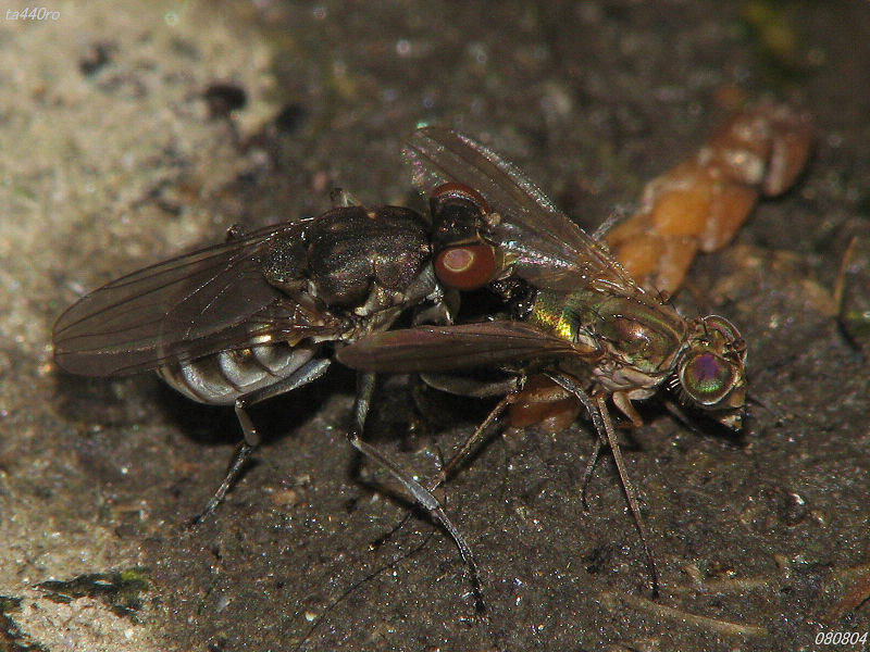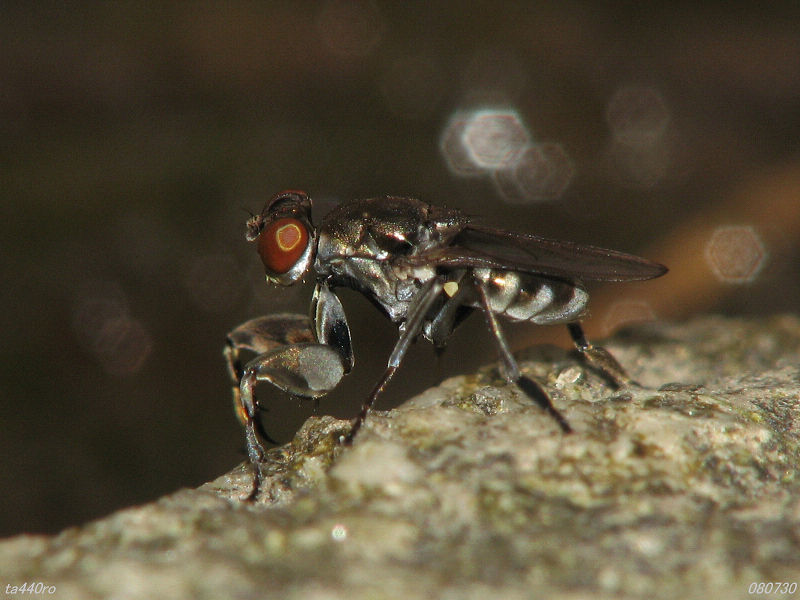▼これは珍しいエノキの樹液。エノキの樹液にもこのような昆虫は集まるとは知らなかった。左からヤセバエの仲間、カナブン、シラホシハナムグリ(シロテンハナムグリ?)、サビキコリの一種。