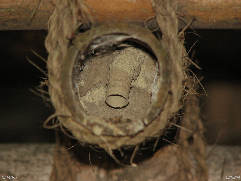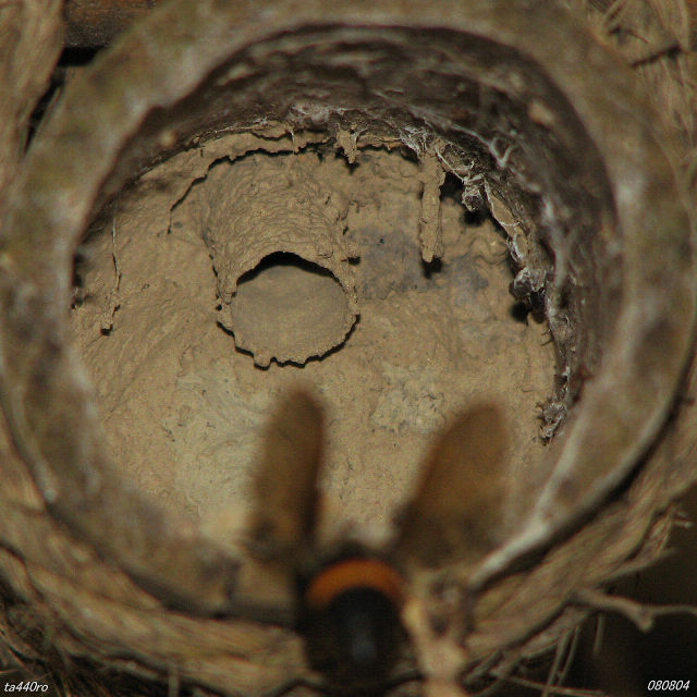 日本ではオスが見つかっておらず、メスだけの単為生殖で世代を繰り返し、しかも次世代のハチも同じ巣(場所?)を使う傾向があるのだとか。もっともこのような雨風を凌げる場所というのが野外では貴重なためにそういう場所を離れないというのはありそうですね。(以上、森林総研のHPを参考にしましたhttp://www.ffpri.affrc.go.jp/labs/seibut/bamboohymeno/species/orancistrocerus-drewseni/0022.html)