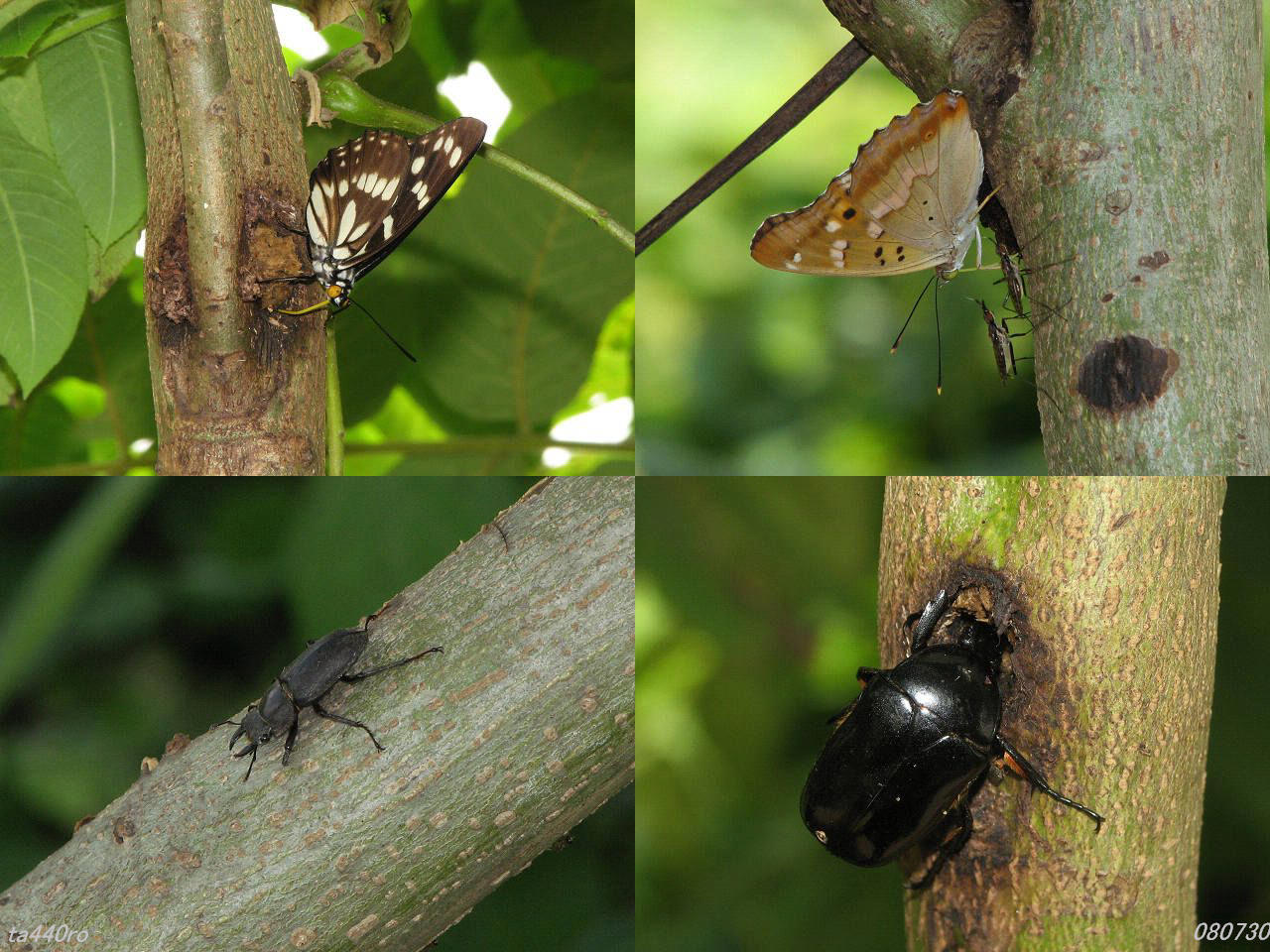 ▼オニグルミの樹液に来た虫たち。左上より時計周りにゴマダラチョウ、コムラサキ♂とヤセバエの仲間、クロカナブン、コクワガタ♂(大顎は小さいが一応オスの個体)