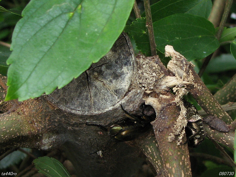 それともう一つ、樹液が出る木として珍しかったのがエノキです。私はエノキにカブトムシやクワガタが寄って来るとは思っていなかったのですが、この写真くらい樹液が出ていれば十分考えられそうですね。080730