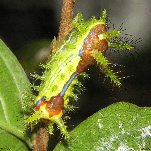 モノトーンで独特の模様をもつ繭も有名ですが、硬くて丈夫そうな、その繭もイラガイツツバセイボウなどの寄生者にやられたり、釣り人にタナゴ釣りの餌として調達されたりで、成虫になるのは意外と大変なようです。080804