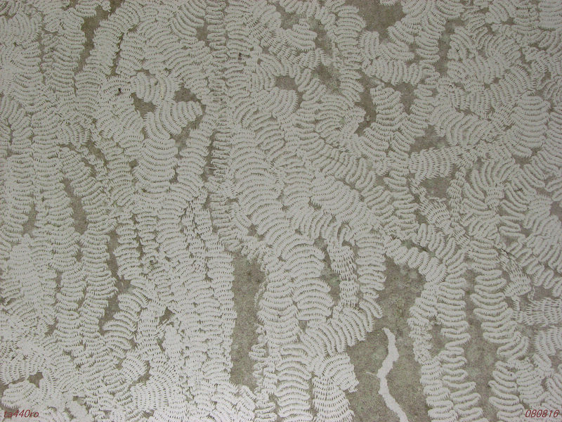 最初はカタツムリかナメクジの這った跡かと思ったのですが、銀色の道がありません。よく見てみると、どうももっと小さな生き物がジグザグに進行したような跡に見えてくるのです。一度通った場所は丹念に避けながら進んでいます。その出来栄えに感心してしまいました。