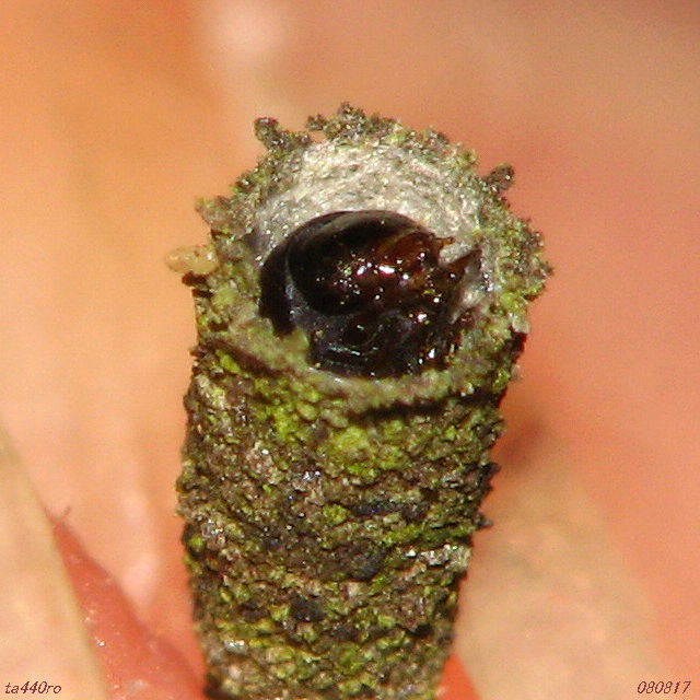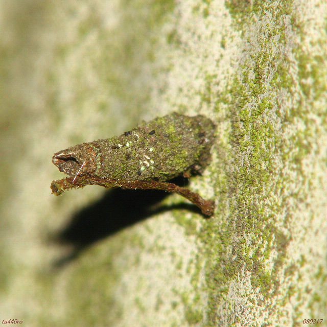 それでも何か手がかりがないかとよく見ていると、小さな突起がいくつも見つかりました。長さ数ミリしかない、ミノムシの蓑のようなものです。つまんでみれば非常に小さな虫が顔を出しているように見えます。写真を撮ってネットで調べてみると・・・・ヒロズミノガという微小なミノムシの仲間のようでした。このサイズの生き物なら、あのジグザグ進行ができます。