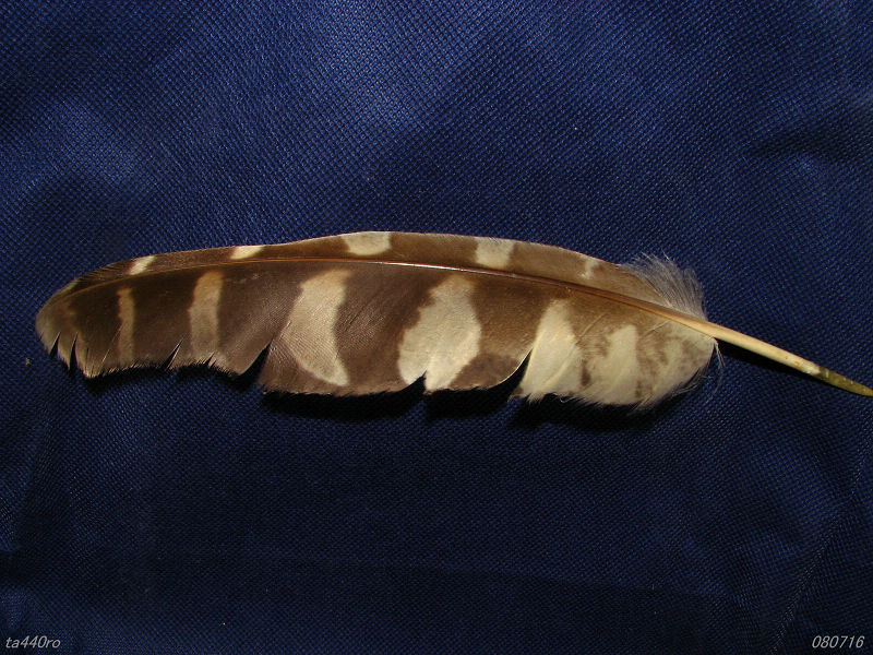 追記:この記事は当初「オオタカの尾羽」としましたが、どうもフクロウの初列風切羽のようなので、書き直しました。もしも再び、羽の見立てが違う場合、教えて頂ければ幸いです。